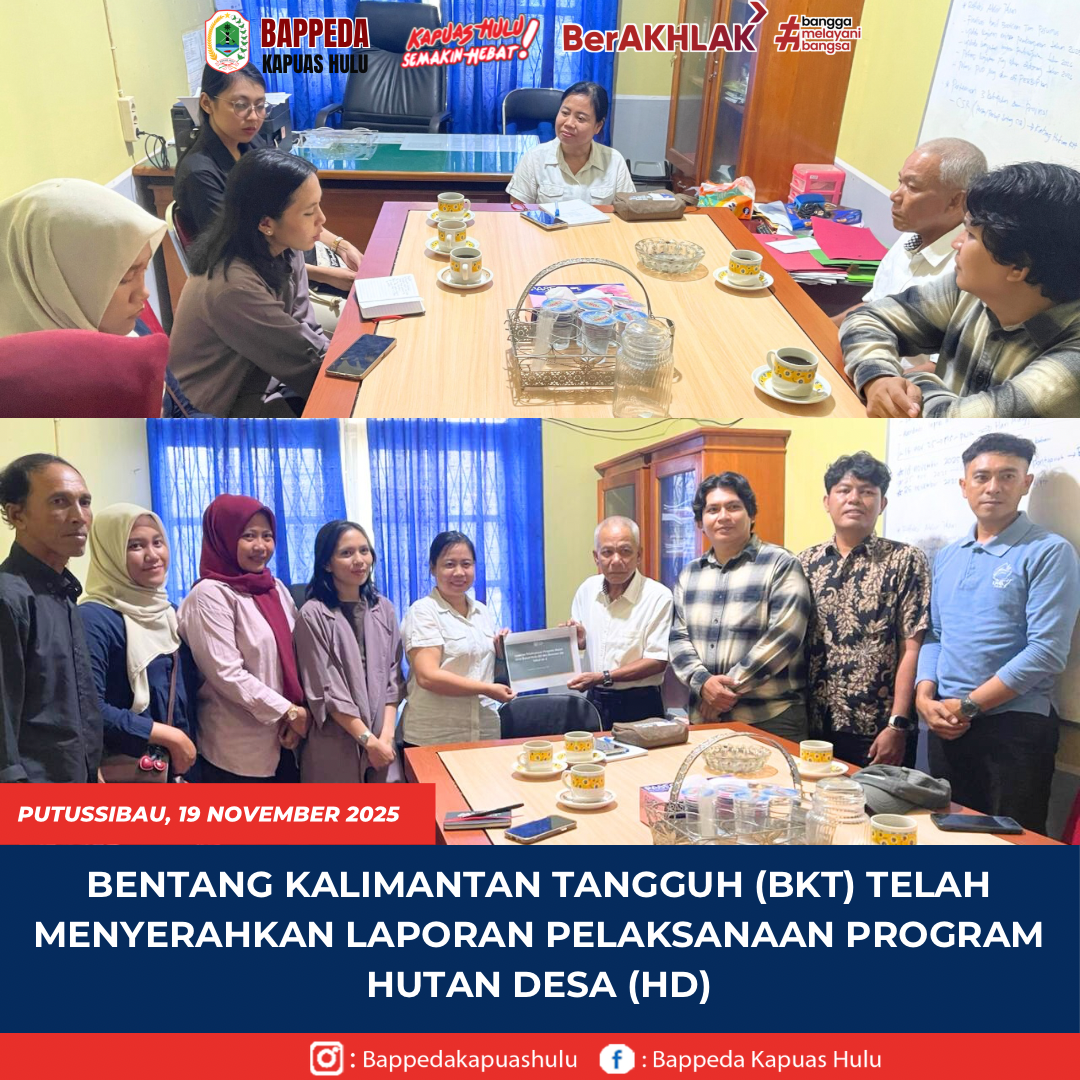 Bentang Kalimantan Tangguh (BKT) telah menyerahkan Laporan Pelaksanaan Program Hutan Desa (HD) Desa Bunut Hulu Kecamatan Bunut Hilir untuk Triwulan III (Q3), beserta Rencana Kerja untuk Triwulan IV (Q4) Tahun ke-2, kepada Badan Perencanaan Pembangunan Daerah (Bappeda) Kabupaten Kapuas Hulu melalui Bidang Perencanaan Perekonomian. Penyerahan laporan ini merupakan bentuk akuntabilitas dan transparansi dalam pelaksanaan program pengelolaan hutan desa berkelanjutan.