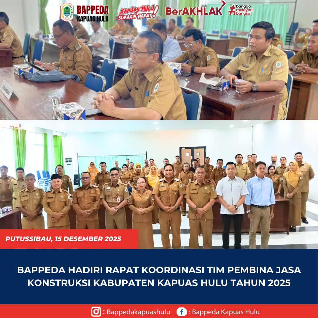 Badan Perencanaan Pembangunan Daerah ( BAPPEDA ) Kabupaten Kapuas Hulu yang di wakili oleh Agus Darmanta, S.T., M.T., Kepala Bidang Perencanaan Fisik, Prasarana dan Pengembangan Wilayah, Menghadiri Rapat Koordinasi Tim Pembina Jasa Konstruksi Kabupaten Kapuas Hulu Tahun 2025, yang bertempat di Aula Dinas Pekerjaan Umum dan Penataan Ruang Kabupaten Kapuas Hulu, Senin (15/12/2025) Pukul 08.30 …
