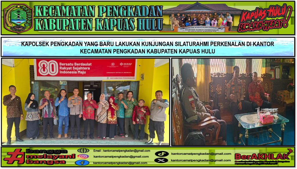 Kapolsek Pengkadan yang baru dilantik, IPTU Dendy Arif Setiady, S.H., M.H., melakukan kunjungan silaturahmi ke Kantor Camat Pengkadan pada pagi hari. Kunjungan ini menjadi bagian dari rangkaian perkenalan sebagai pejabat baru sekaligus upaya mempererat sinergi dalam pelaksanaan tugas pokok Polri sebagaimana diatur dalam Undang-Undang Kepolisian Negara RI Nomor 2 Tahun 2002, meliputi: