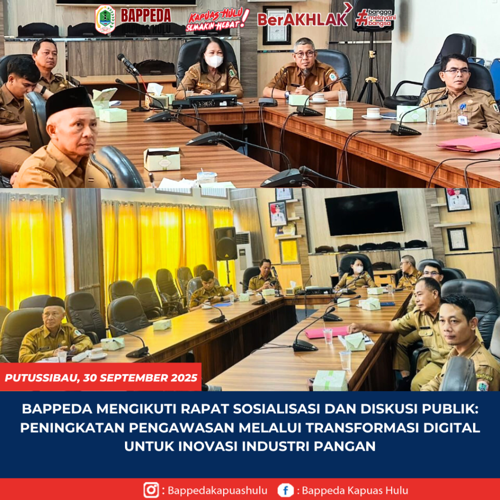 Badan Perencanaan Pembangunan Daerah ( BAPPEDA ) Kabupaten Kapuas Hulu yang di wakili oleh Sekretaris Bappeda Dedy, S.T.,M.T beserta staff Anjang Eko Prasetyo,S.E , Sri Wahyuni,S.A.P dan Dody Suhendra, S.A.P. menghadiri kegiatan zoom meeting Sosialisasi dan Diskusi Publik: Peningkatan Pengawasan Melalui Transformasi Digital Untuk Inovasi dan Industri Pangan, yang bertempat di Ruang Rapat Bupati Kapuas Hulu, Selasa (30/09/2025).
