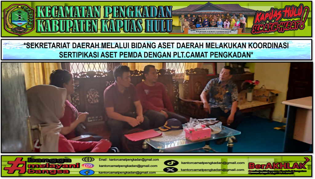 Kamis (02/10/2025) Plt.Camat Pengkadan SEKONI,S.Sos menerima kunjungan Sekretariat Daerah Kabupaten Kapuas Hulu Melalui Bidang Aset Daerah , M.Fahrrurazi,S.Pi. Kunjungan ini dalam rangka koordinasi pendaftaran tanah aset milik Pemda Kabupaten Kapuas Hulu.