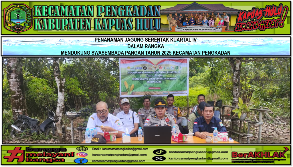 Dalam rangka mendukung program nasional swasembada pangan tahun 2025, jajaran Polsek Pengkadan melaksanakan penanaman jagung serentak kuartal IV,Penanaman dilakukan oleh PLH.Polsek Pengkadan IPDA SURYADI, Plt.Camat Pengkadan SEKONI.S.Sos,Kepala BPP Kecamatan Pengkadan DEDI SUSANTO, S.PKP serta personel Bhabinkamtibmas di lahan milik PT Ceram Agrotama Energi (CAE), Kasi Trantibum Kecamatan Pengkadan,Kades Riam Panjang, dan staf BPP Kecamatan pengkadan serta para kelompok tani akan melakukan penanaman jagung pada kegiatan nasional kuartal IV tahun 2025, Rabu (08/10/2025) .