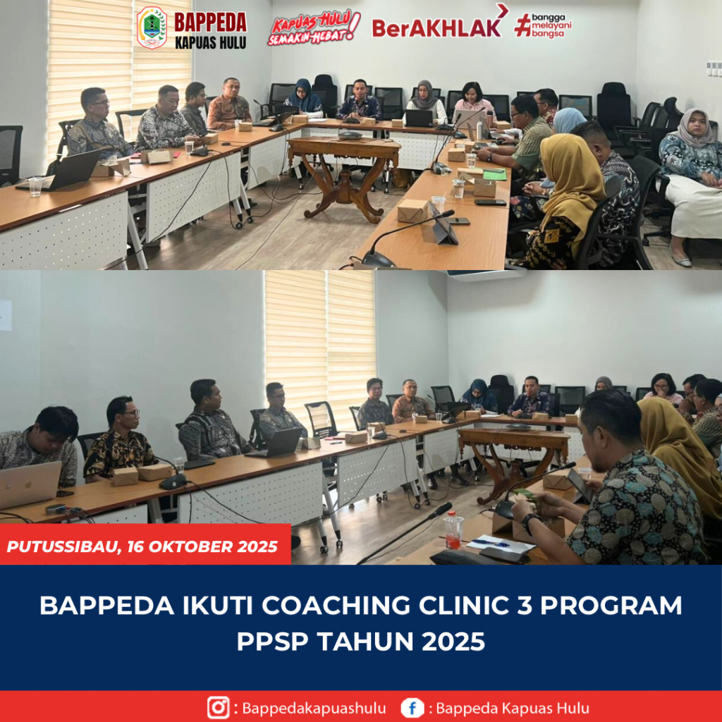 Badan Perencanaan Pembangunan Daerah (BAPPEDA) Kabupaten Kapuas Hulu yang di wakili oleh Kabid Bidang Fisik Prasarana Fispra Agus Darmanta,S.T.,M.T beserta staff , Dan Kabid Pengendalian, Penelitian dan Pengembangan Eka Fittriadie Syafa’at,S.Kom.,M.A.P beserta Staff , Hadir juga Kepala Bidang Penyehatan Lingkungan Dinas PUPR Mengikuti Kegiatan Choching Clinic 3 Program Percepatan Pembangunan Sanitasi Permukiman (PPSP) Tahun 2025, Kegiatan ini dilaksanakan di Ruang Rapat Bappeda Provinsi Kalimantan Barat, Pontianak.(16/10/2025)