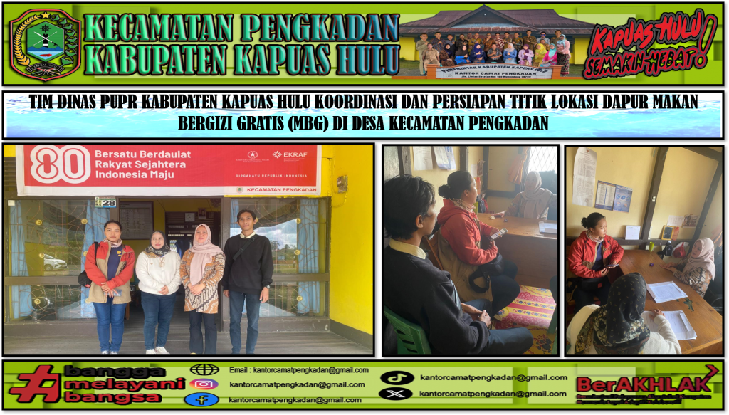 Tim Dinas PUPR Kabupaten Kapuas Hulu melakukan koordinasi dan pengecekan titik Lokasi dapur untuk kegiatan Makan Bergizi Gratis (MBG) untuk Kecamatan Pengkadan dalam hal ini Camat Pengkadan Diwakili Kasi Ekon Ibu Mirawati,S.Pi,.MM bersama melakukan koordinasi dan membahas titik Lokasi ke Dapur MBG yang direncanakan di 3 Desa Kecamatan Pengkadan, yang dalam waktu dekat akan ditetapkan sebagai salah satu Lokasi dapur pelaksana kegiatan MBG di wilayah Kecamatan Pengkadan.