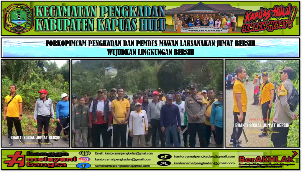 Sebagai wujud kepedulian terhadap kebersihan lingkungan, warga Desa Mawan Bersama Forkopimcam Pengkadan mengadakan kegiatan bersih-bersih pada hari Jumat, dimulai pukul 08.00 WIB, Jumat (24/10/2025). Kegiatan ini dihadiri oleh seluruh warga desa, serta PJ.Kepala Desa Mawan, Bapak GUNAWAN,Plt.Camat Pengkadan SEKONI,S.Sos, Kapolsek Pengkadan (IPTU DEDNY ARIF SETIADY, S.H,.M.H), Kepala BPP Kecamatan Pengkadan DEDI SUSANTO, S.PKP yang turut serta memberikan dukungan dan semangat kepada masyarakat.