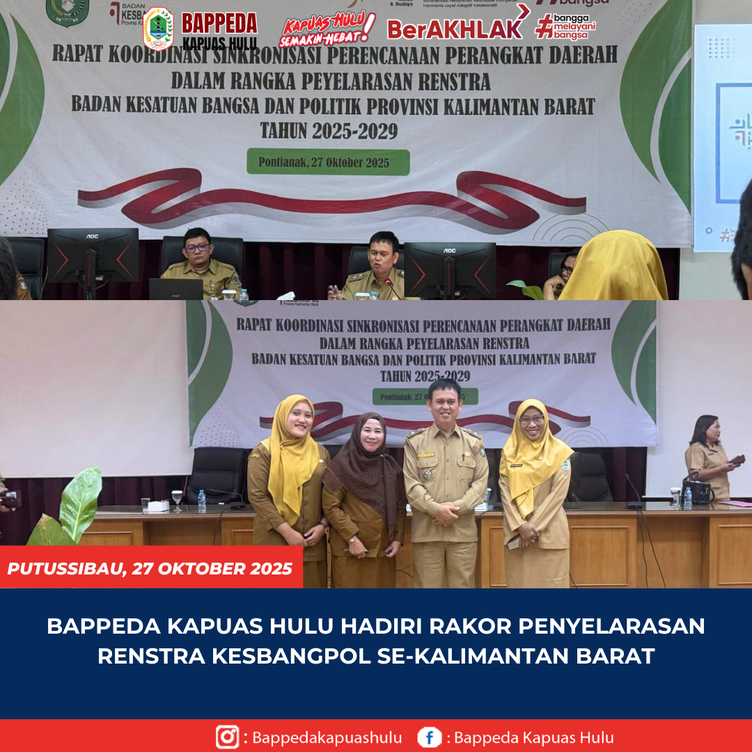 Badan Perencanaan Pembangunan Daerah ( BAPPEDA ) Kabupaten Kapuas Hulu yang di wakili oleh Kartiniwati,S.E Staff dari Bidang Perencanaan Sosial Budaya Bappeda Kabupaten Kapuas Hulu, menghadiri Rapat Koordinasi Penyelarasan Renstra Badan Kesatuan Bangsa dan Politik Provinsi Kalimantan Barat Tahun 2025–2029 yang diselenggarakan di Ruang Rapat Tengkawang, Kantor Gubernur Kalimantan Barat, Pontianak. Senin (27/10/2025). Kegiatan ini …
