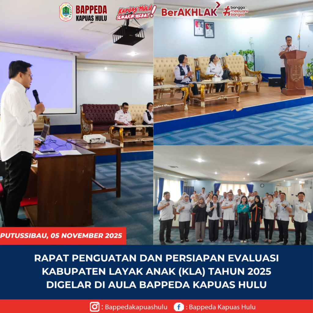 Badan Perencanaan Pembangunan Daerah ( BAPPEDA ) Kabupaten Kapuas Hulu melalui bidang sosial Budaya melaksanakan Rapat Penguatan dan Persiapan Evaluasi Kabupaten Layak Anak (KLA) Tahun 2025, bertempat di aula bappeda, Rabu 05/11/2025 pukul 08.00 WIB.