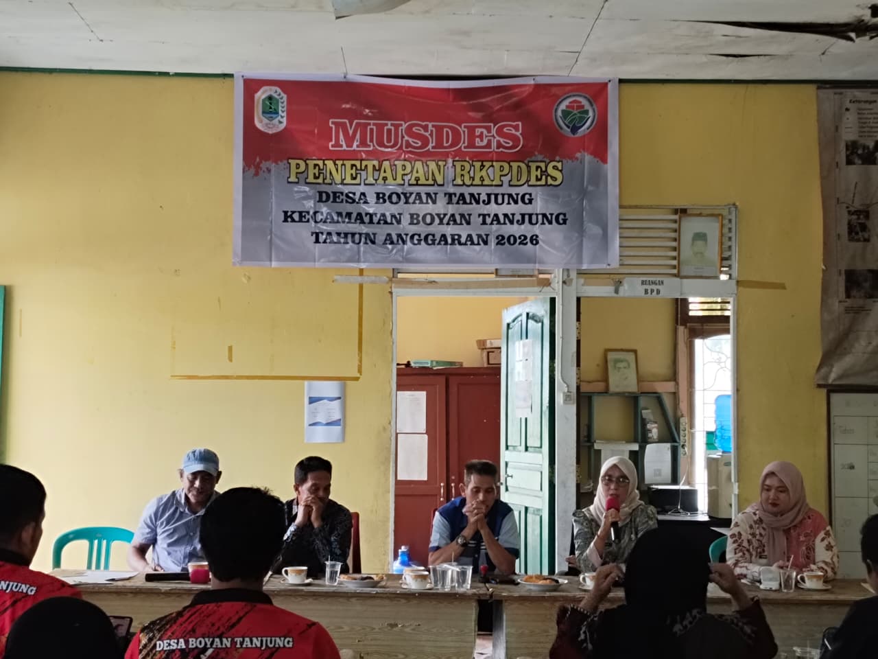Desa Boyan Tanjung Kecamatan Boyan Tanjung Melaksanakan Kegiatan Musyawarah desa dalam rangka Penetapan RKP Desa Tahun 2026 di Kantor Desa Boyan Tanjung Kamis (13/11/ 2025). Kegiatan tersebut dihadiri oleh Kasi Ekbang dan Staf Kantor Camat Boyan Tanjung, Pemerintah Desa Boyan Tanjung, BPD, Tokoh Masyarakat, Perwakilan dari PKK, Kader Posyandu, Guru Paud, Tokoh Adat dan lain-lain. …