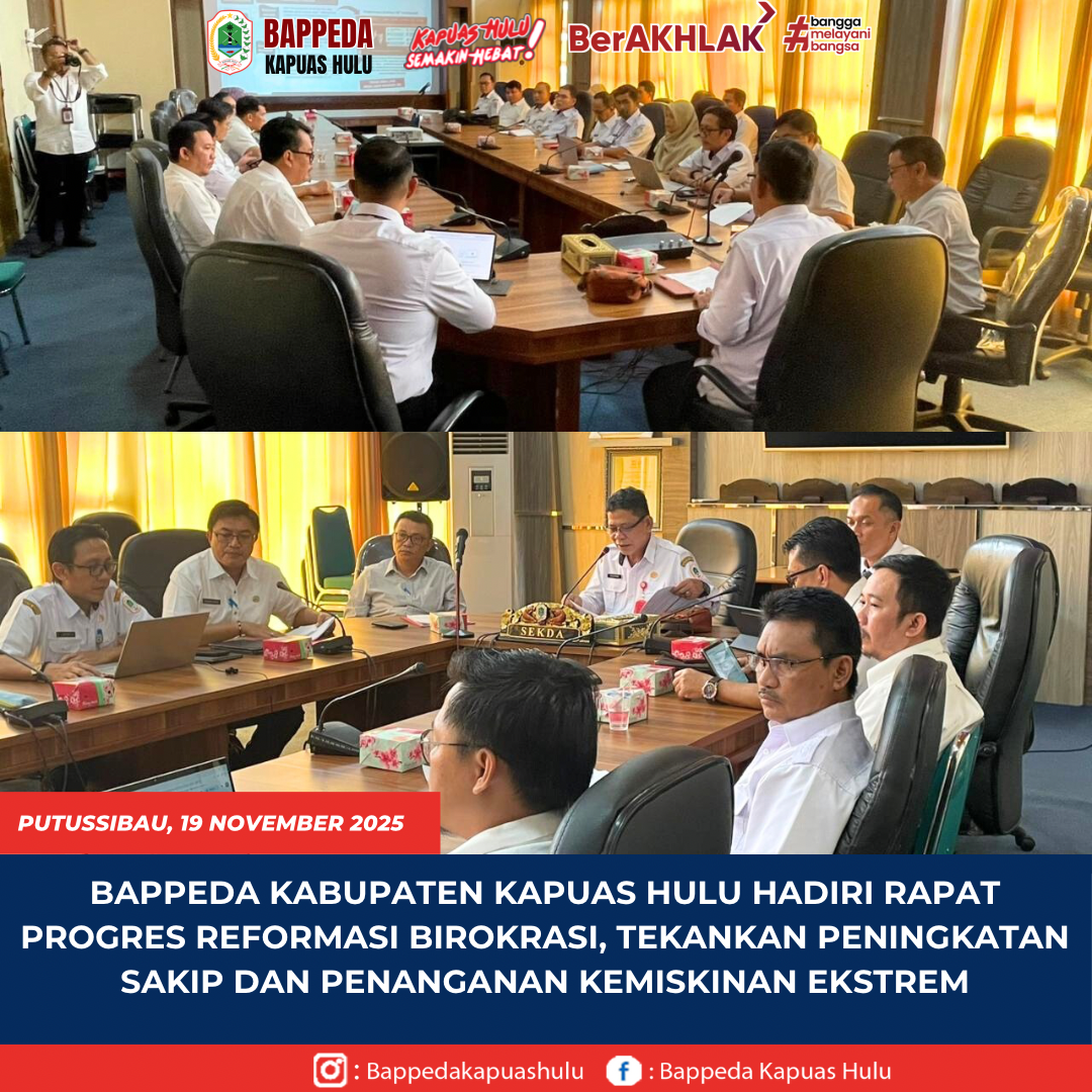 Kepala Kepala Badan Perencanaan Pembangunan Daerah (Bappeda) Kabupaten Kapuas Hulu Ambrosius Sadau,S.H.,M.Si bersama Kepala Bidang Perencanaan Sosial dan Budaya Kristoforus Orlando,S.I.P.,M.Si dan Kepala Bidang Pengendalian Penelitian dan Pengembangan Eka Fittriadie Syafa’ad,S.Kom.,M.A.P menghadiri Rapat Koordinasi Penyampaian Progress Capaian Rencana Aksi Reformasi Birokrasi Tahun 2025 s/d Triwulan III yang digelar di Ruang Rapat Bupati, Rabu (19/11/2025). Kegiatan …