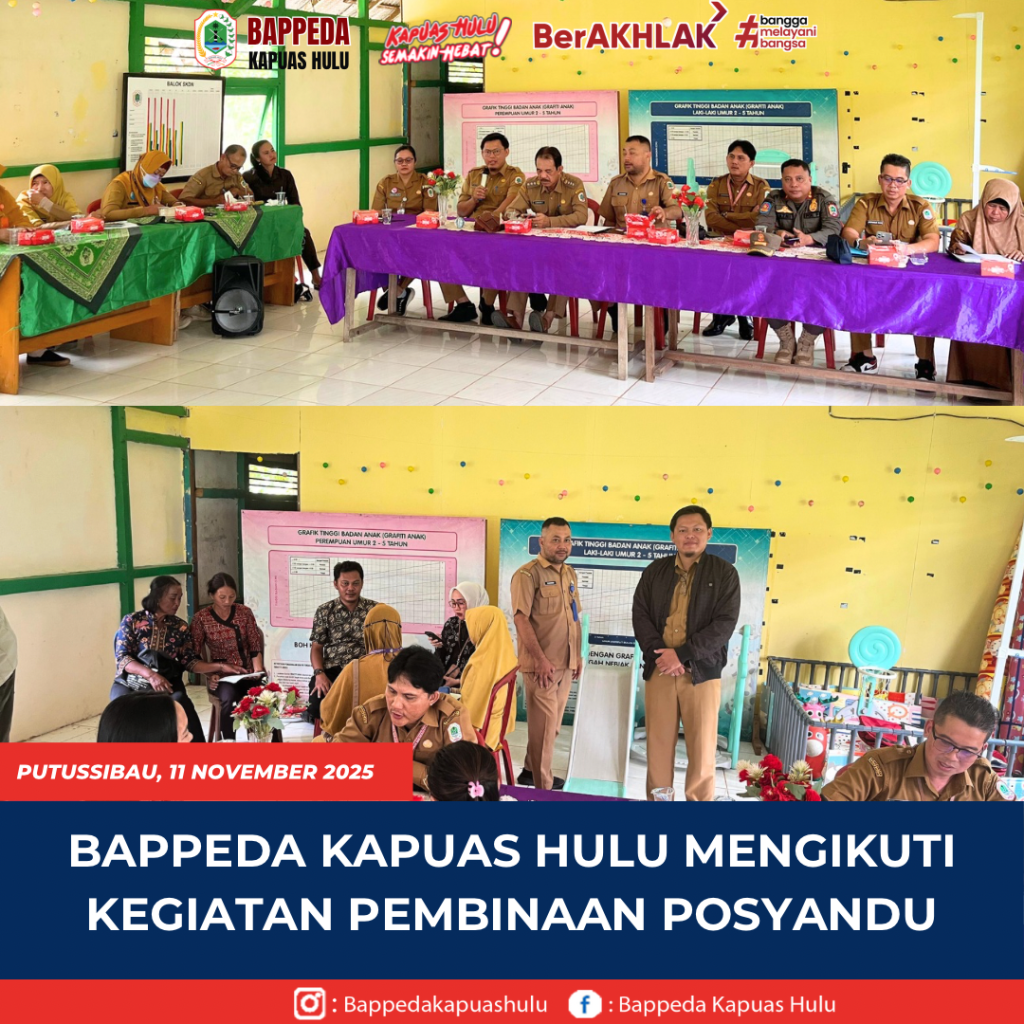 Badan Perencanaan Pembangunan Daerah ( BAPPEDA ) Kabupaten Kapuas Hulu yang di wakili oleh Kabid Perencanaan Sosial Budaya Kristoforus Orlando,S.IP.,M.Si mengikuti Kegiatan Pembinaan Posyandu oleh Tim Penggerak (TP) Posyandu Kabupaten Kapuas Hulu bersama lintas perangkat daerah terkait, yang bertempat di Desa Sungai Uluk Kecamatan Putussibau Selatan, Kabupaten Kapuas Hulu, Selasa (11/11/2025).