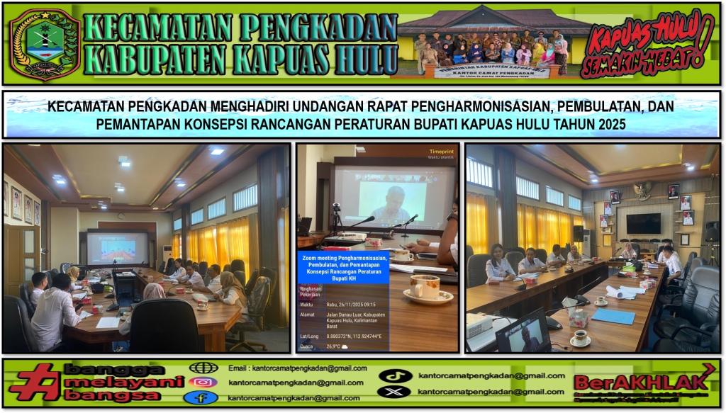 Zoom meeting Rapat dilaksanakan pada hari Rabu (26/11/2025), bertempat di Ruang Rapat Kantor Bupati Kapuas Hulu, Kegiatan harmonisasi ini juga dihadiri oleh Asisten Pemerintahan dan Kesejahteraan Rakyat Sekretariat Daerah Kabupaten Kapuas Hulu,Kepala Dinas Pemberdayaan Masyarakat dan Desa Kabupaten Kapuas Hulu,Kepala Bagian Tata Pemerintahan Setda Kab.Kapuas Hulu,Kepala Bagian Hukum Setda Kab.Kapuas Hulu,Perwakilan Camat Bika,Perwakilan Camat Pengkadan,Analis Kebijakan ahli muda bagian tata pemerintahan setda kab.kapuas hulu,Perencanaan Paeraturan Perundangan-undangan Ahli Muda Hukum Setda Kab.kapuas Hulu, Perencanaan Paeraturan Perundangan-undangan Ahli pertama Hukum Setda Kab.kapuas Hulu,Analis Hukum Ahli pertama Bagian hukum Setda Kab.kapuas Hulu.