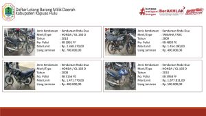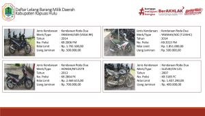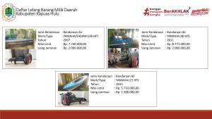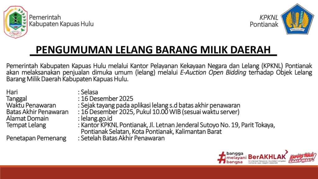 Dalam rangka pemindahtanganan barang milik daerah berupa kendaraan dinas yang sudah tidak digunakan dalam kegiatan operasional, dengan ini diumumkan bahwa Sekretariat Daerah Kabupaten Kapuas Hulu akan melaksanakan lelang kendaraan dinas melalui Kantor Pelayanan Kekayaan Negara dan Lelang (KPKNL) Pontianak akan melaksanakan penjualan dimuka umum (Lelang) melalui E-Auction Open Bidding terhadap Objek Lelang Barang Milik Daerah Kabupaten Kapuas Hulu, Rabu (10/12/2025).