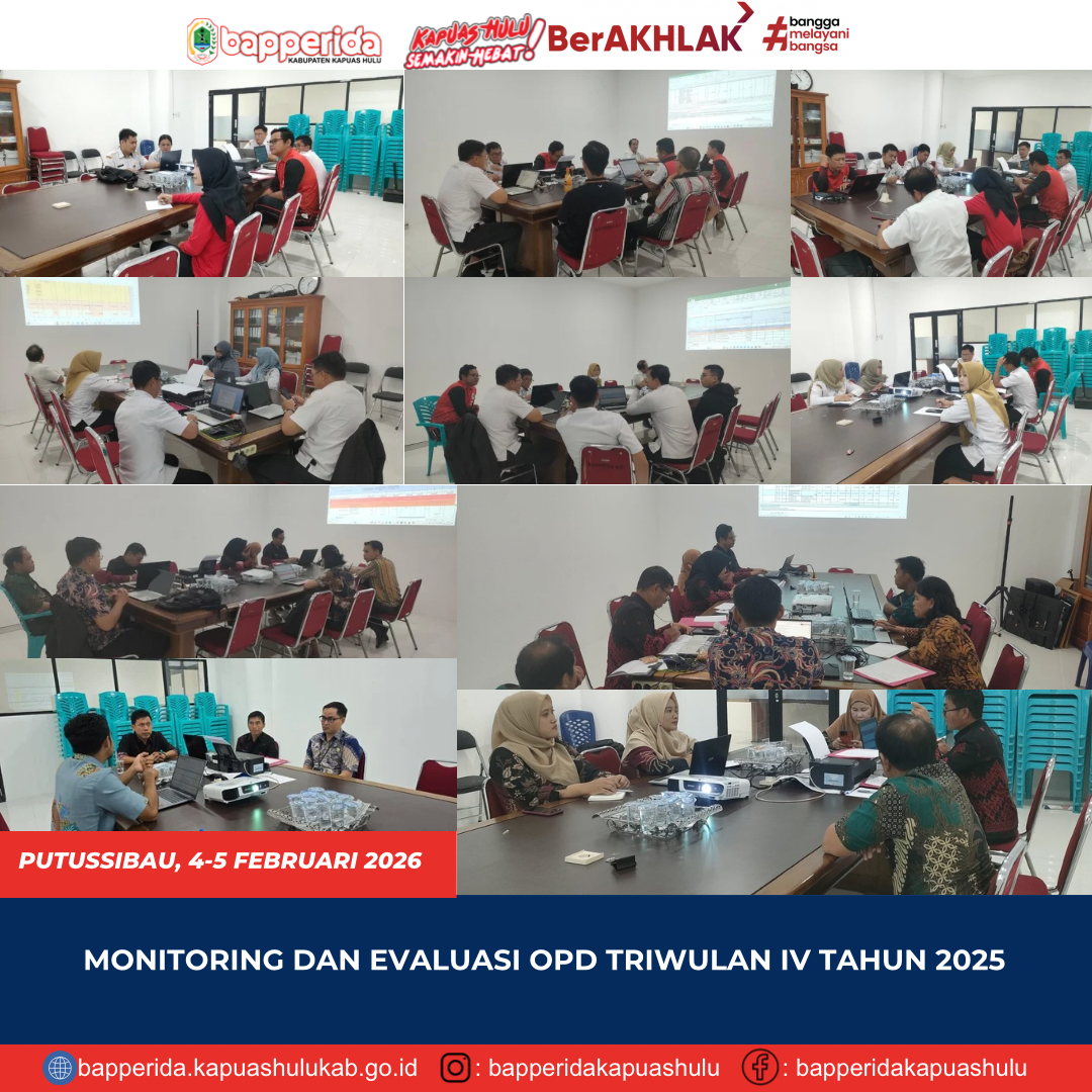 Badan Perencanaan Pembangunan, Riset dan Inovasi Daerah (BAPPERIDA) Kabupaten Kapuas Hulu Melalui bidang Pemerintahan dan Pembangunan Manusia melaksanakan kegiatan Monitoring dan Evaluasi (MONEV) Organisasi Perangkat Daerah (OPD) Triwulan IV Tahun 2025 pada Rabu-Kamis, 4-5 Februari 2026, bertempat di Ruang Rapat Bapperida, Gedung Satap Kabupaten Kapuas Hulu. Kegiatan ini bertujuan untuk mengevaluasi capai AZan kinerja program …