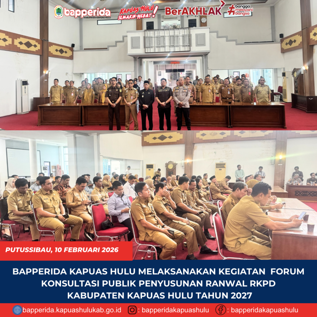 Badan Perencanaan Pembangunan, Riset dan Inovasi Daerah (BAPPERIDA) Kabupaten Kapuas Hulu melalui bidang Perencanaan, Pengendalian melaksanakan kegiatan Forum Konsultasi Publik Penyusunan Rancangan Awal RKPD Kabupaten Kapuas Hulu Tahun 2027, yang bertempat di Ruang Rapat Paripurna DPRD Kabupaten Kapuas Hulu, Selasa (10/02/2026) pukul 07.30 WIB.