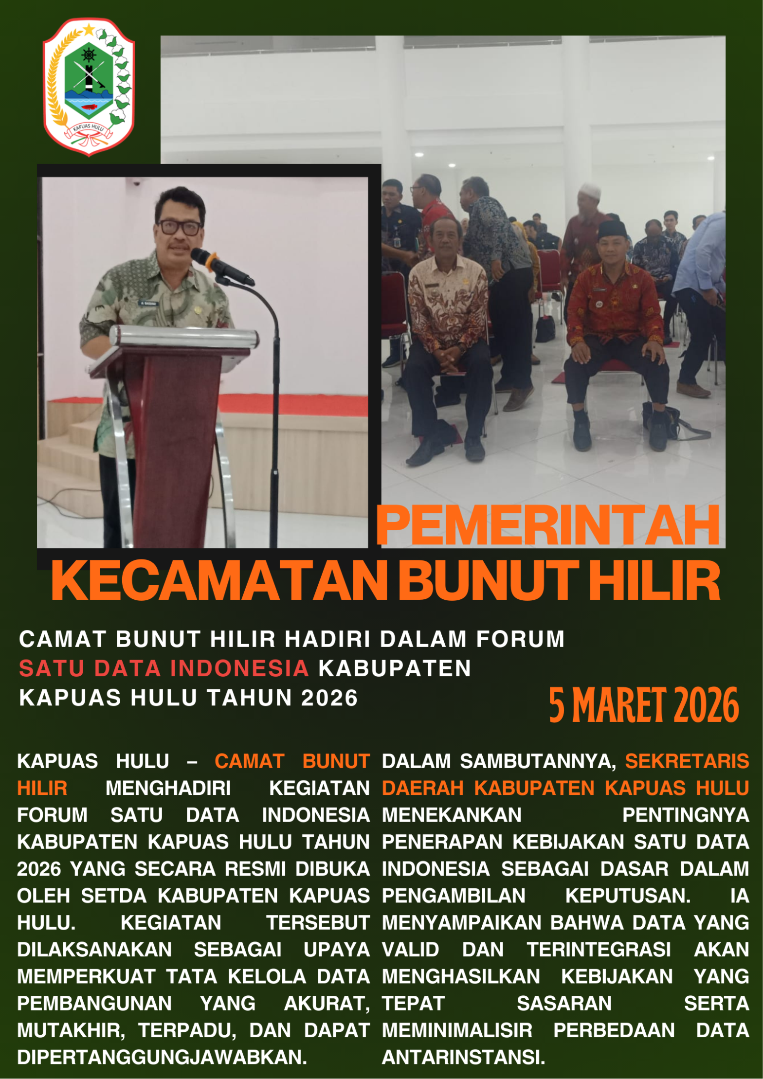 Camat Bunut Hilir menghadiri kegiatan Forum Satu Data Indonesia Kabupaten Kapuas Hulu Tahun 2026 yang secara resmi dibuka oleh Sekretaris Daerah (Setda) Kabupaten Kapuas Hulu. Kegiatan tersebut dilaksanakan dalam rangka memperkuat tata kelola data pembangunan yang akurat, terpadu, dan berkelanjutan, Kamis (5/3/2026). Forum yang digelar di tingkat kabupaten ini diikuti oleh para kepala perangkat daerah, …