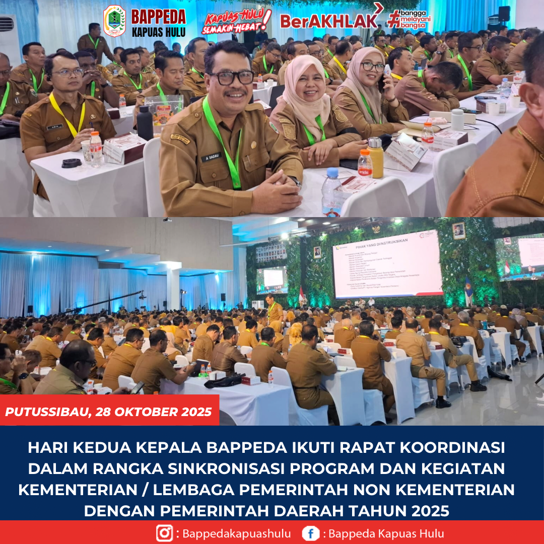 Kepala Badan Perencanaan Pembangunan Daerah ( BAPPEDA ) Kabupaten Kapuas Hulu Ambrosius Sadau,S.H.,M.Si mengikuti Rapat Koordinasi Dalam Rangka Sinkronisasi Program Dan Kegiatan Kementerian / Lembaga Pemerintah Non Kementerian Dengan Pemerintah Daerah Tahun 2025 Hari Kedua, yang bertempat di Kampus IPDN Jatinangor, Selasa (28/10/2025). Kegiatan hari kedua ini masih di hadiri oleh Sekretaris Daerah dan Kepala …