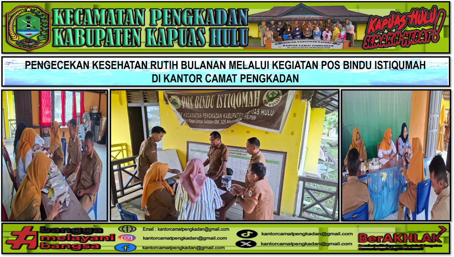 Pengecekan kesehatan rutin bulanan di kantor camat biasanya melibatkan kerja sama dengan Puskesmas setempat atau tim kesehatan yang ditunjuk untuk melakukan skrining kesehatan berkala bagi para Pegawai di Kecamatan pengkadan. Pengecekan Kesehatan di lakukan di Aula Kantor Kecamatan pengkadan, Senin (10/11/2025).Jenis Pemeriksaan yang Umum Dilakukan bersifat skrining dasar, yang mencakup:1. Pengukuran tekanan darah2. Pengecekan gula …