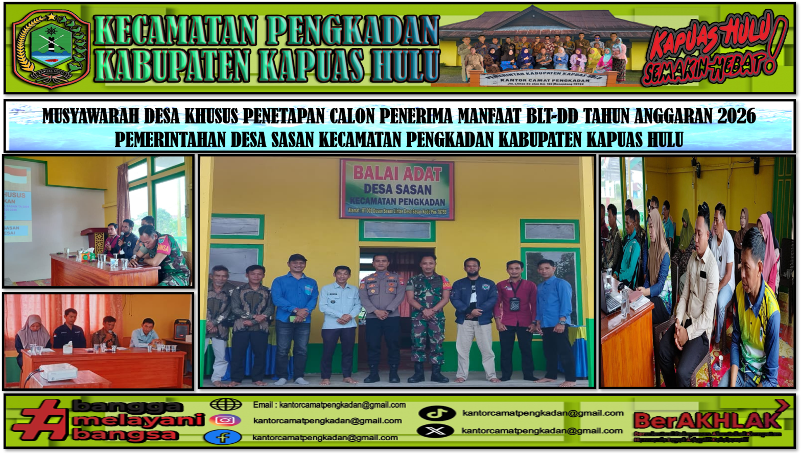 Pemerintah Desa Sasan melaksanakan kegiatan Musyawarah Desa Khusus (Musdesus) dalam rangka Penetapan Calon Penerima Manfaat Bantuan Langsung Tunai Dana Desa (BLT-DD) Tahun Anggaran 2026. Acara ini dilaksanakan di Balai Adat Desa Sasan dengan penuh khidmat dan dihadiri oleh berbagai unsur, mulai dari Kapolsek Pengkadan,Danramil Jongkong-Pengkadan,Perwakilan dari Kecamatan Pengkadan, pendamping desa, tokoh masyarakat, perwakilan kelompok masyarakat, serta unsur Desa Sasan, Jumat (12/9/2025).